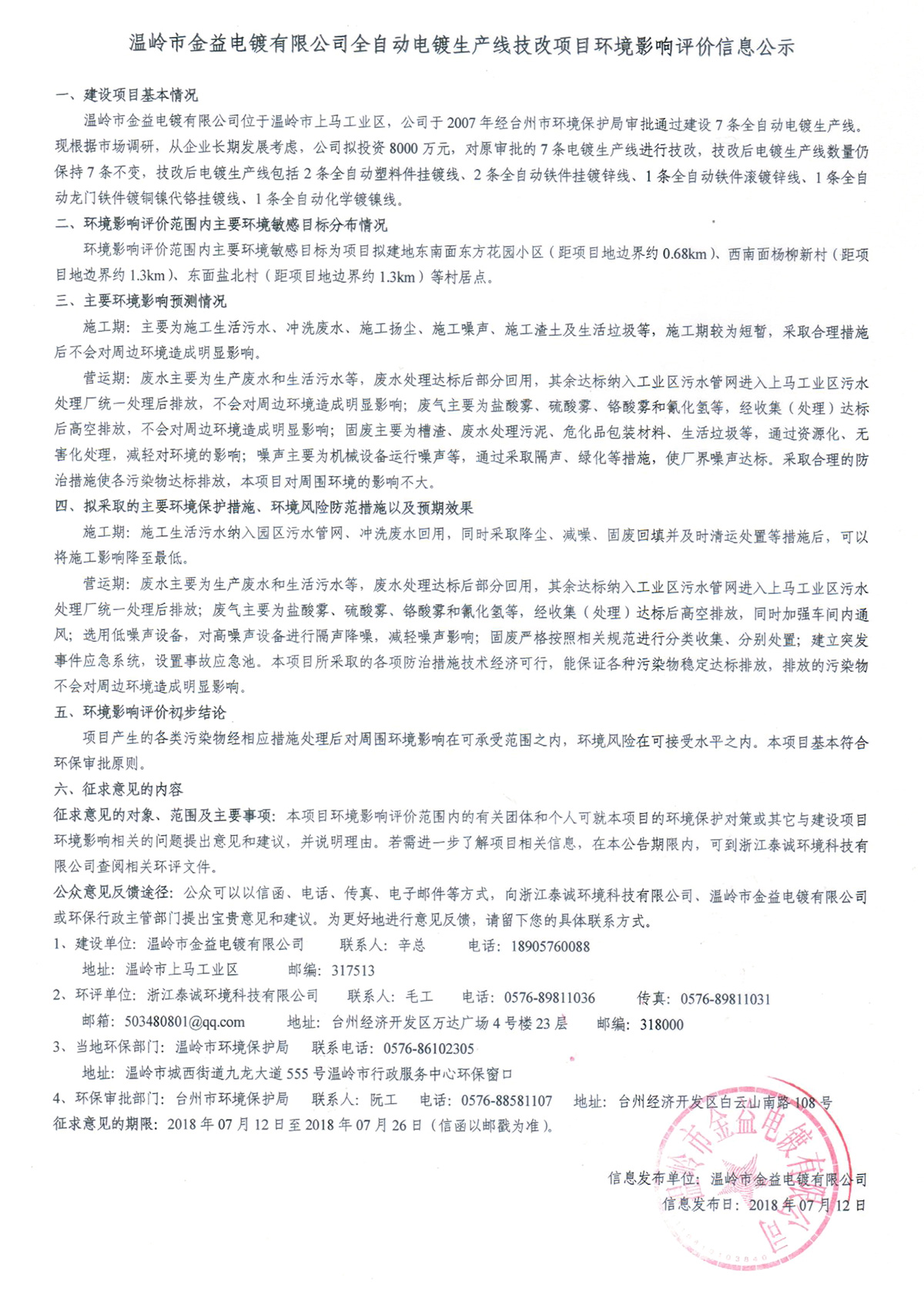 温岭市金益电镀有限公司全自动电镀生产线技改项目环境影响评价信息公示